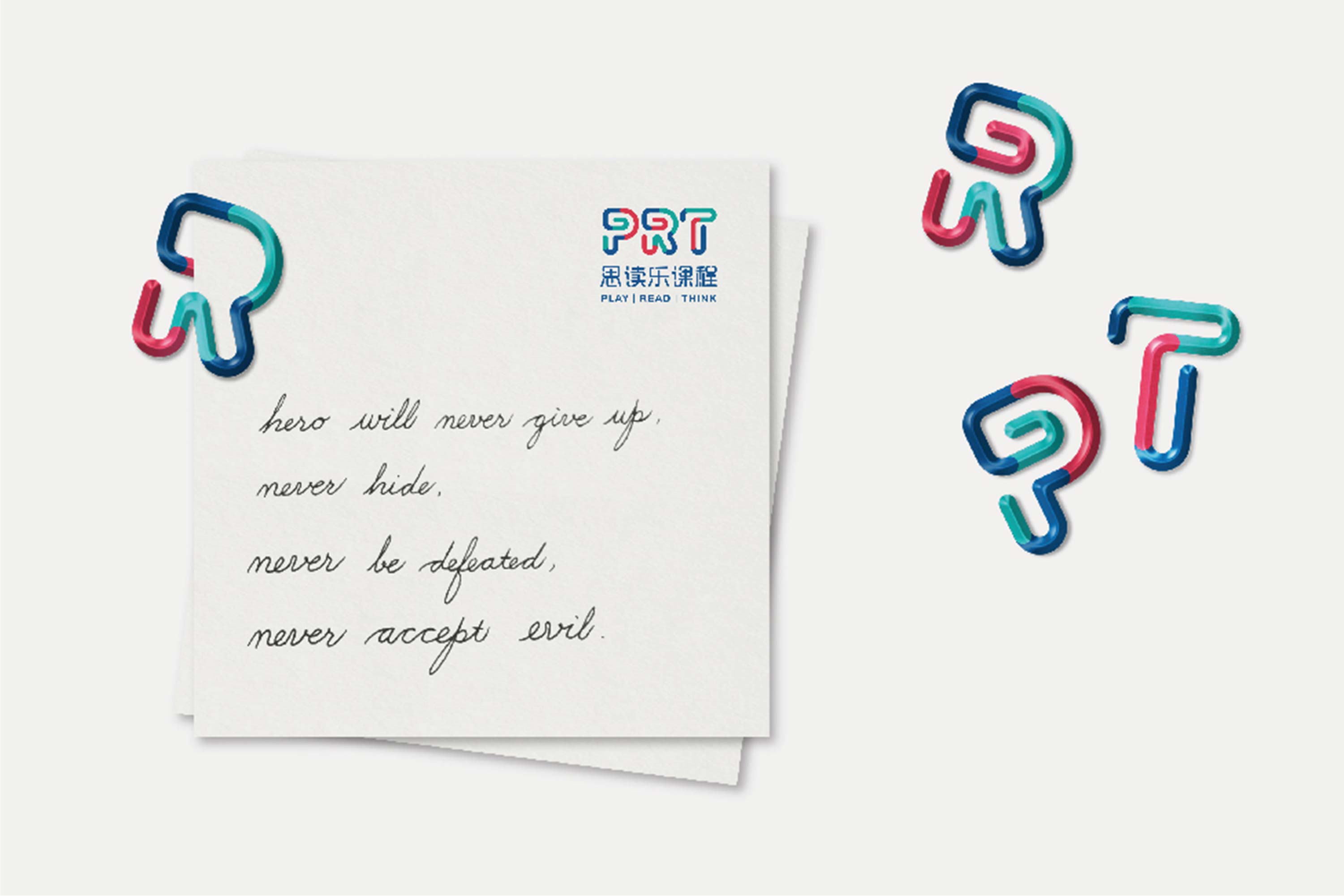在字体设计的过程中我们融入了以下元素:「大脑回路」,象征课程研发人员的研究与思考;「接轨符号」,象征通过思读乐课程孩子与国际接轨;「曲别针」,象征无限的创造力。最终将PRT课程的深度研究、悉心洞察以及针对性设计的专业性以视觉符号呈现出来。